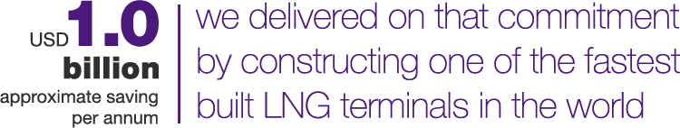 The year 2014 was a year of execution for Engro. Last year we had communicated our resolve to apply our engineering and management capabilities to develop short, medium and long term solutions for the debilitating energy crisis. This year we delivered on that commitment by constructing the fastest LNG terminal in the world – an engineering feat that speaks volumes of our ability and our willingness to identify with national challenges and help resolve them. The LNG terminal – built at a cost of USD 135 million – has a regasification capacity of up to 600mmcfd and would lead to a savings of approximately USD 1.0 billion per annum to the national exchequer.