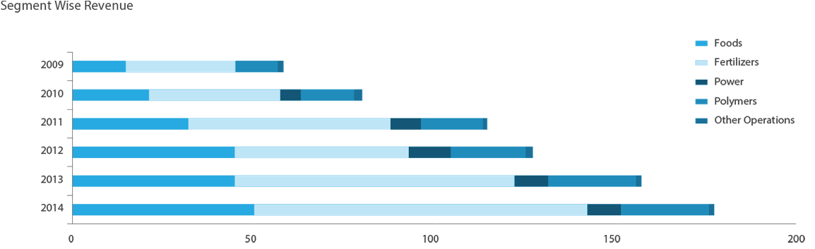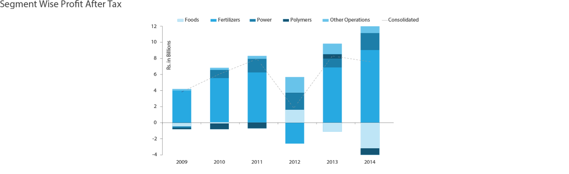 Engro Corporation continued to exhibit a strong underlying performance, despite major challenges faced due to sharp commodity price declines and Rupee appreciation. The company registered record revenue of PKR 175,958 million vs. PKR 155,360 million in 2013, on a consolidated basis, achieving a 13% YoY top line growth. The consolidated profit-after-tax (attributable to owners) was PKR 7,007 million as opposed to PKR 7,818 million during 2013. Profitability was led by Engro Fertilizers, which benefited from improved capacity utilization with both plants operating throughout the year. Engro Eximp achieved healthy trading margins in DAP fertilizer, despite the volatility in the international commodity price, due to correctly timing the purchases when international market prices were low. Engro Foods during the year continued to build on its growth story by achieving its highest ever UHT market share. Engro Powergen and Engro Vopak continued to perform in line with expectation, given their stable business models. The overall profitability, however, was negatively impacted by losses in rice business owing to lower international prices, coupled with an unprecedented Rupee appreciation earlier in 2014.