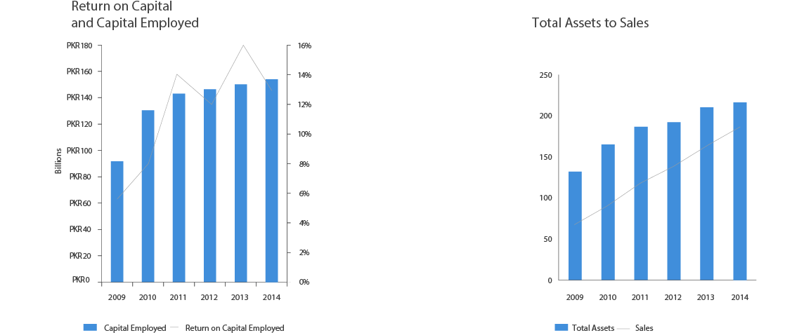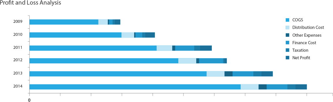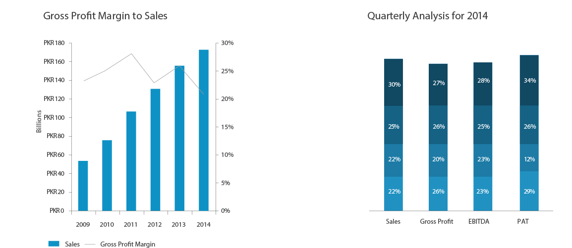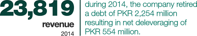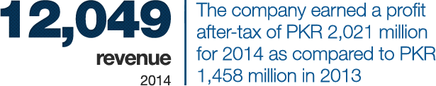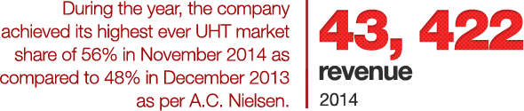 In 2014, the company focused on further strengthening its position by gaining market share in the UHT category. During the year, the country as well as the local foods industry faced numerous challenges. The energy crisis, security and political situation continued to exert significant pressure on the economy and business operations. Despite these challenges, the company registered double digit revenue growth with positive long-term outlook, while testing opportunities for business expansion through diversification into new product lines and brand extensions. In terms of operations, the company successfully restored its distribution network and significantly increased its milk collection. Further, it commissioned a new powder plant, which, the management believes, will help reduce volatility in margins over long-term and enable the organization in achieving its strategic growth objectives. The company reported PKR 43, 422 million in consolidated revenue vs. PKR 37,929 million reported in 2013, exhibiting a growth of 14%. Effective investment on brands and efficient product mix management remained key elements in the achievements of growth in topline of 2014. Gross margin declined from 22% to 19% on account of higher milk prices in the first half of the year, which were not passed on to consumers in the competitive market environment. The company also recorded an impairment charge of PKR 596 million on sale of its Canadian operations. During the year, based on the advice of tax consultant, a tax credit amounting to PKR 667 million has been recorded on account of balancing, modernization, replacement, extension and expansion of plant and machinery. On an overall basis, the company’s profit increased from PKR 211 million in 2013 to PKR 889 million in 2014.