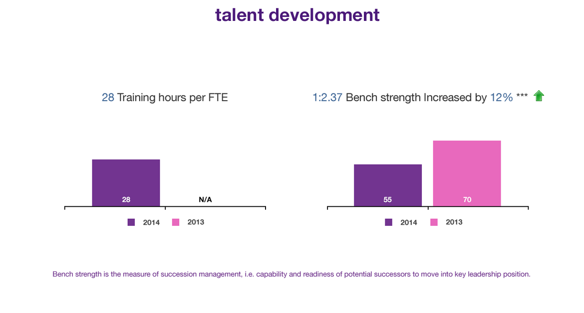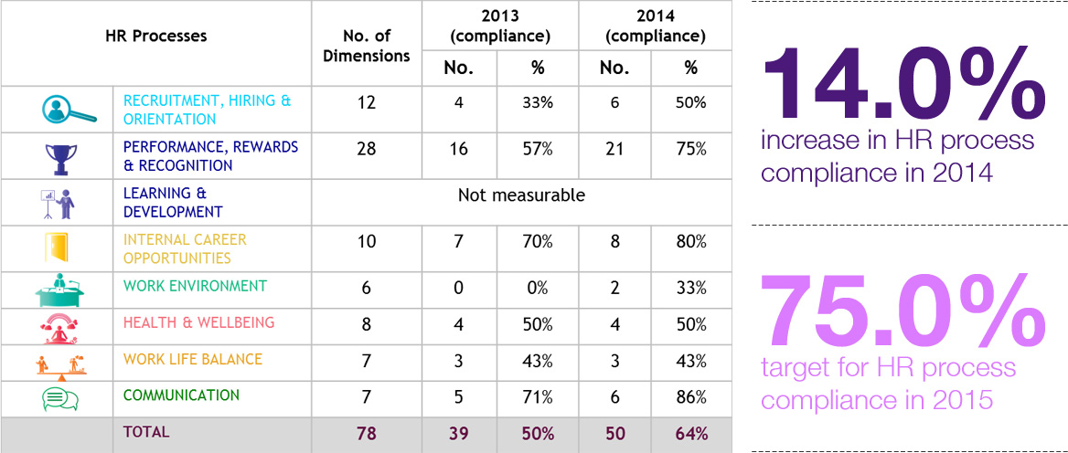 Our HR process compliance now stands at 64% in 2014 which is a 14% increase from 2013. An action plan to go above and beyond 75% compliance is already in place focusing on work-life balance, health & well-being & recruitment & on-boarding.