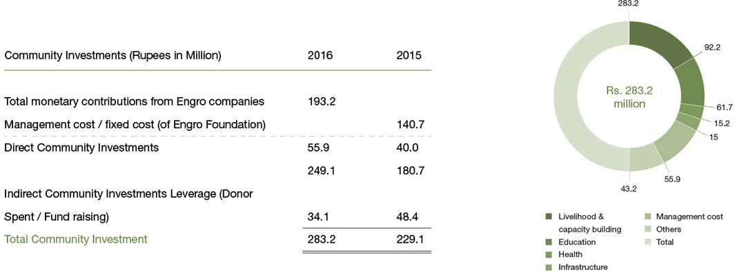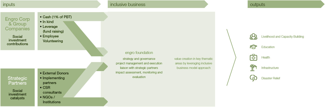 Engro’s social capital value creation model is driven by our approach of an inclusive and sustainable business model based on the concept of “shared value” between Engro and the communities its businesses operate in. Our social capital is monitored and managed by Engro Foundation, a body responsible for all community development initiatives. The inputs to this model are the financial contributions (1% of net profit before tax) from each Engro group company, together with financial contributions from external donors and volunteering time of Engro employees which are invested and mobilized by Engro Foundation in various social development projects. The key thematic areas Engro Foundation focuses on include: livelihood, skills development, education, health, and infrastructure and disaster relief.