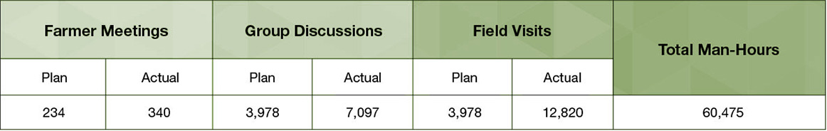 The program aimed at enhancing farm productivity of small to medium - sized farmers in rice-wheat cropping systems of punjab and sindh through value-added farm advisory services. 158 villages were covered in the program that stretched across 39,269 acres of land, targeting 5,177 registered farmers and 23,000 companion farmers. the services included provision of crop literature, farmer-field school trainings on bcmps, innovative crop management techniques, soil testing and weather advisory with a field staff of almost 18 workers, consisting of 3 field officers, 12 field assistants, 1 master trainer, 1 social mobilizer & 1 women mobilizer.