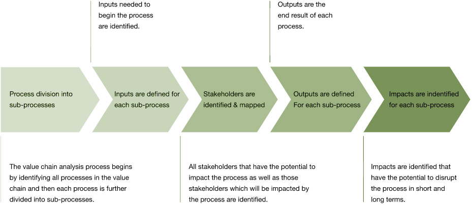 we believe that in order to effectively manage the impacts of our businesses and have a better picture of the key hotspots, our value chains should be analyzed in depth. for this purpose, we began with analyzing the value chains of engro fertilizers and engro polymer and chemicals. the value chain of these two businesses were divided into various processes and each process was then analyzed for inputs, outputs, stakeholders involved in each process and key impacts as shown below: